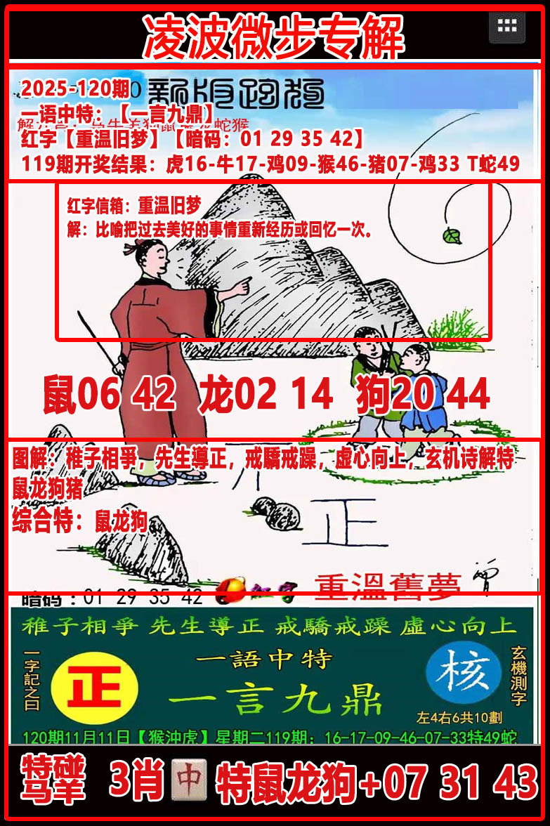 解析:红字:重溫舊夢,重解重开上期的蛇;温带"氵"解水肖鼠猪;舊带"艹"解木肖虎兔;梦解虚幻的龙。【释义】比喻再经历一次过去的光景。解去年120期开鼠。